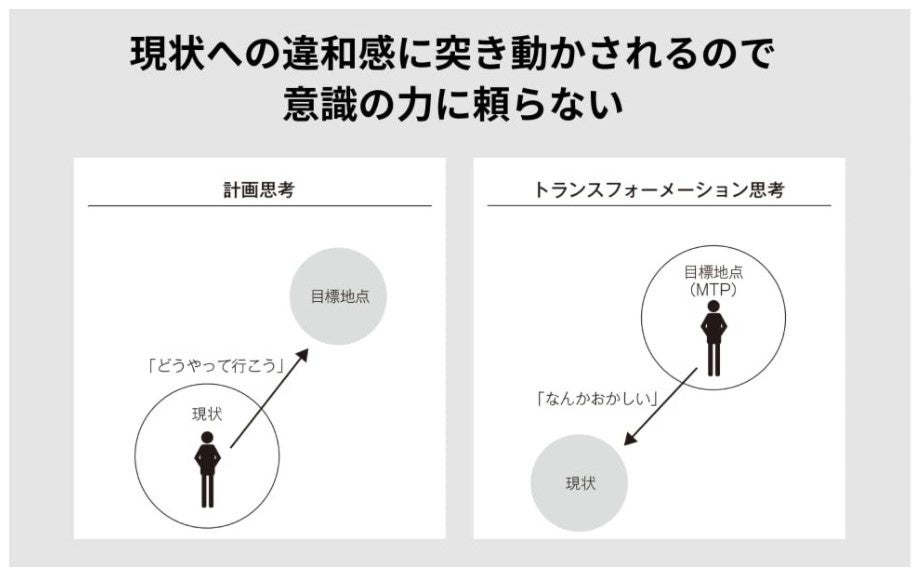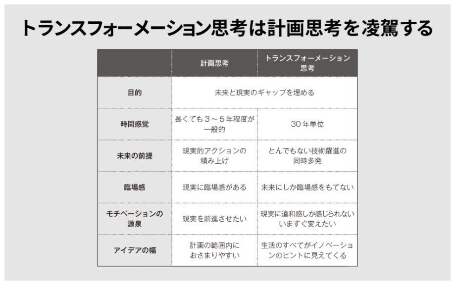 トランスフォーメーション思考とは、「大きな未来を解像度高く描くこと」、「その未来への臨場感を保ち続けること」で得られる思考です。ここでの「大きな未来」とは、個人や組織が最低30年以上先に実現する現状とはまったく異なるような世界観であり、その未来視点で現状を見たときの違和感が高いモチベーションへとつながります。この思考を身につけて、街を見渡せばすべてが大きなイノベーションのチャンスに見えてくるし、事業に対する見え方も根本から変化するようになるのです。