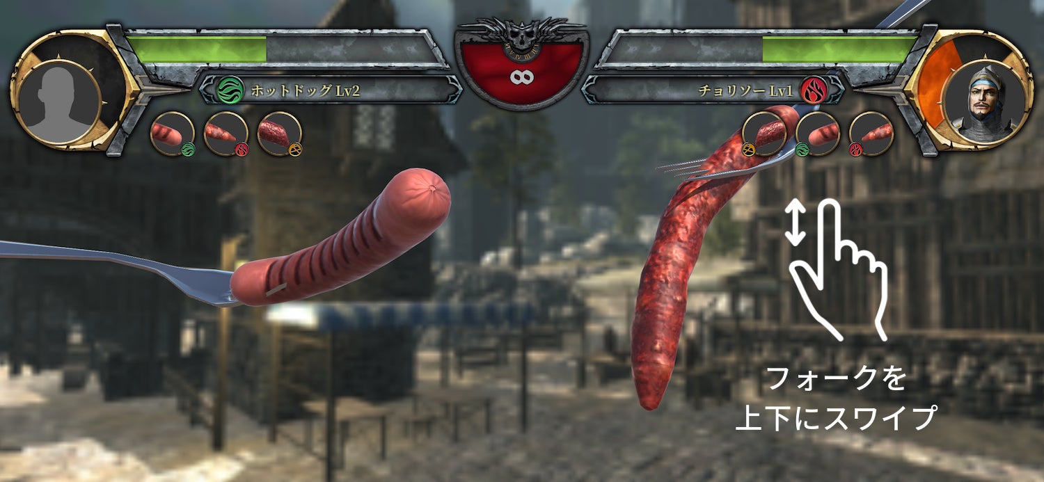 基本ルールは、画面を長押ししてパワーをチャージし、ぶらぶらと揺れるソーセージをタイミングよく突き出し、相手ソーセージにぶつけてHPを削り切ることが目的のゲームです。ソーセージの動きは物理演算で再現されており、動きを予想しながら攻撃を繰り出すというユニークなゲームプレイが見どころです。