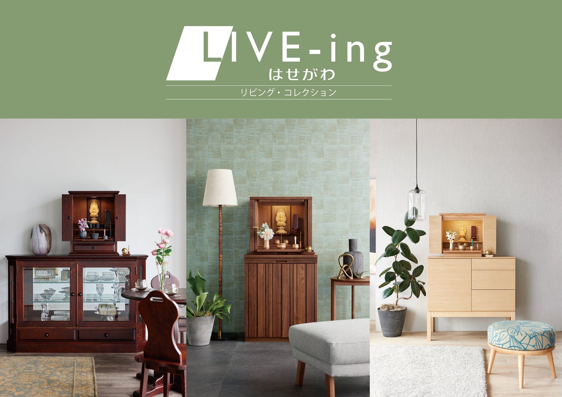 愛知県の家具メーカー「カリモク家具」をはじめ、全国各地の国内家具メーカーと共同開発したお仏壇シリーズ「リビング・コレクション」は、使用している素材やデザインなど、ご家庭の家具とよく馴染む人気商品です。その他、お客様のライフスタイルに沿った様々なお仏壇を取り揃えています。