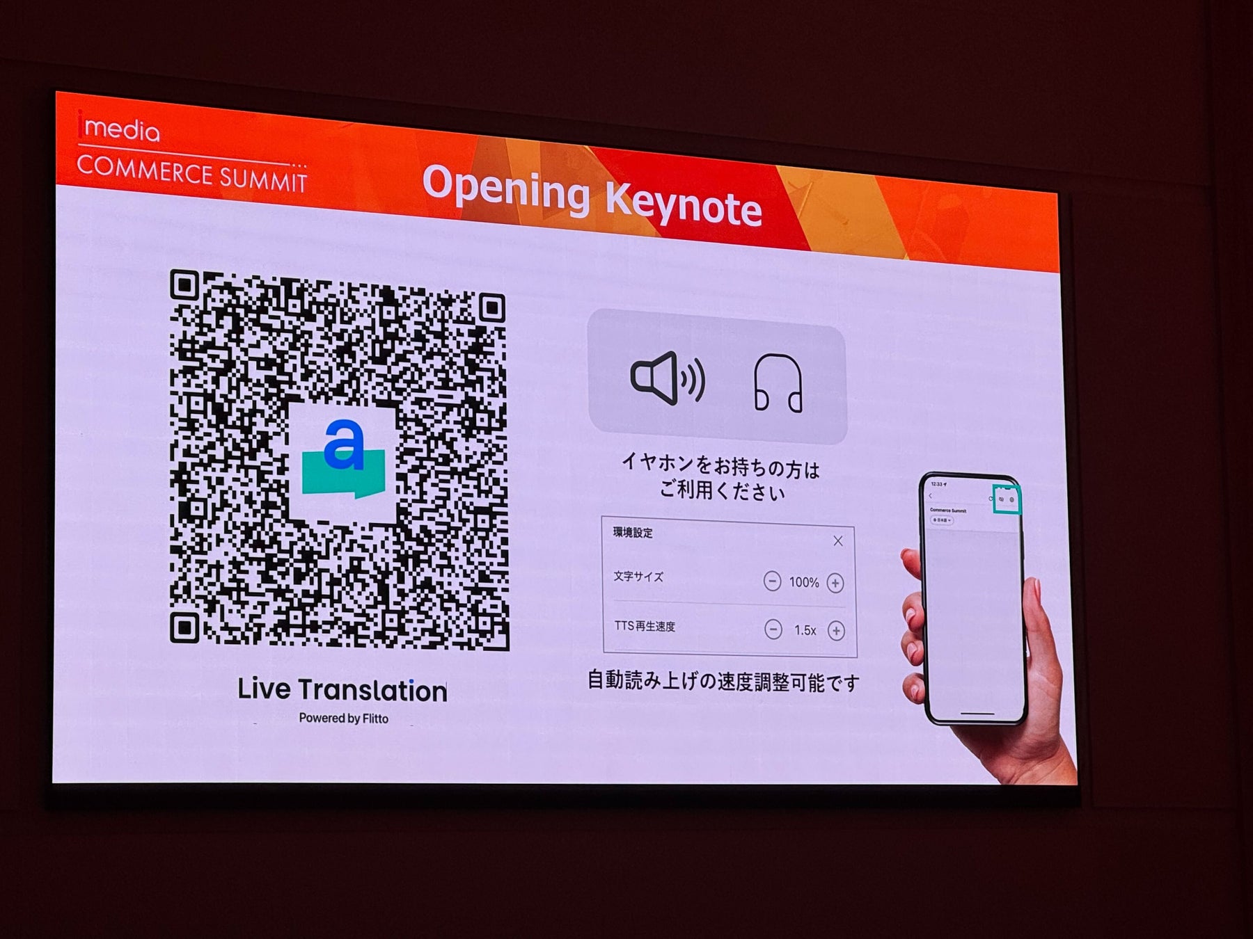 2025年6月 広島・ヒルトン広島で開催された【Commerce Summit 2025】(主催:Comexposium Japan)は、EC・リテール業界のリーダーが集まり、最新動向や課題について議論を交わすハイレベルな会議に、FlittoのAI同時通訳サービス「Live Translation」 が導入され、多様な言語環境の参加者がリアルタイムでセッションを理解・共有できる画期的な体験を実現しました。