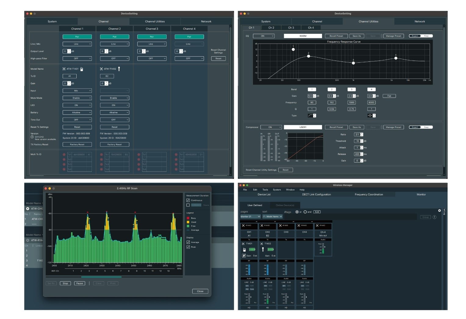 『System 20 PRO』 は、専用ソフトウェア「Wireless Manager」でトータル管理が可能です。遠隔での機器設定変更・マルチペアリング機能の切り替え・オフラインで作成した設定をオンラインの機器へ反映するなど、オーディオテクニカのワイヤレス機器を一括で管理できます。また、ユーティリティ設定でGAIN・EQ・COMPなどの詳細設定や機器の設定状態を、プロジェクトファイルとして保存することが可能。さらにWireless Managerから各機器の最新ファームウェアをアップデートできます。