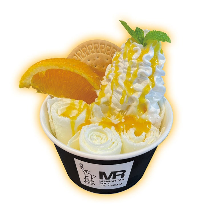 ミルクベースのアイスにクリームチーズをミックス。オレンジとビスケットをトッピング。 オレンジソースをかけて仕上げました。