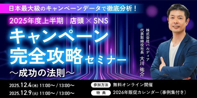 株式会社パルディア(https://www.paldia.co.jp/)は、累計13万件以上のキャンペーンデータを保有する「CAM-SAKU(キャンサク)」を活用した最新分析をもとに、【日本最大級のキャンペーンデータで徹底分析!2025年度上半期 店頭×SNSキャンペーン完全攻略セミナー ~成功の法則~】を、2025年12月4日(木)・12月9日(火)に開催いたします。