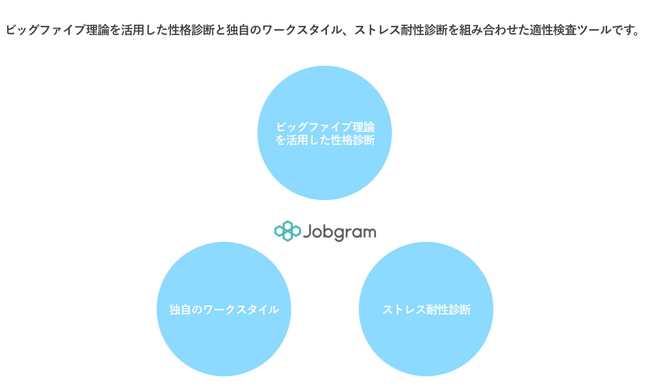 Jobgramは、ビッグファイブ理論を活用した性格診断と独自のワークスタイル、ストレス耐性診断を組み合わせた適性検査ツールです。急成長企業を中心に利用され、様々な性格特性の人がどのようなポジション・役割で活躍しているかのデータを大量に蓄積しています。