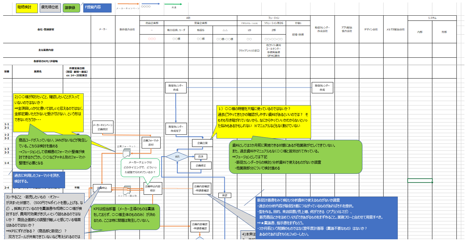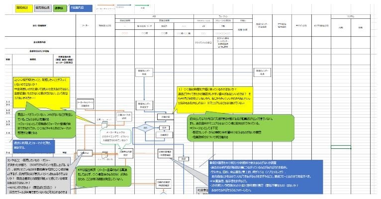 当該業務がどのように行われているのか、時系列、関係部署、そこに関連するKPIなどを整理します。