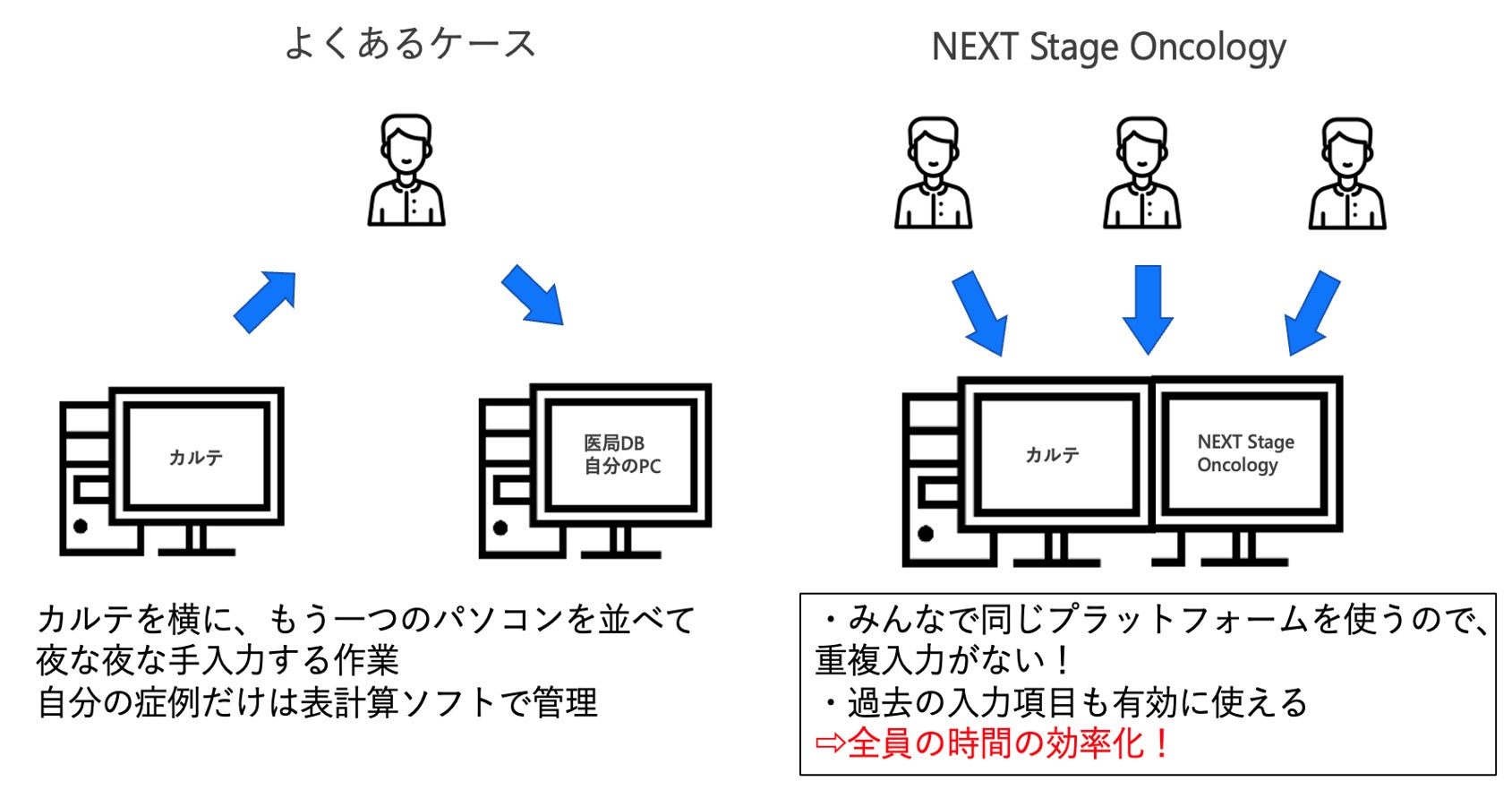 医療現場における日々の診療においては、患者の主訴や理学所見、アセスメントや医療判断などはカルテに記載され、多くの場合、文章などの非構造化データして記録されます。このようなデータは医師ごと・施設ごとの記載のバリエーションが多く、標準化されていないデータとして蓄積されます。その結果、後日行う臨床的な統計や研究の推進が非効率になってしまいます。病院によっては、テンプレートを作成して記載の定型化を図ることがありますが、テンプレートも病院ごとのバリエーションが生じるため、日本全国でデータを収集するには不向きです。そこで、がん診療を行う病院の多くの診療科では、診療科独自のデータベースを作成し、カルテとは別個にデータを保管していることがほとんどです。こうした診療科独自のデータベースはその後の統計解析などに有用である反面、診療科ごとにデータベースが乱立した結果、依然として日本全体としてデータを統合することは容易ではありません。加えて、診療科独自のデータベースは基本的に医師が自力で転記して作成、管理していることがほとんどです。TXP Medical は、そのような診療科独自のデータベースを高度化した構造化汎用データベースであるNEXT Stage Oncology を2022 年4 月より提供しています。複雑なデータベースはややもすると入力が困難になりがちですが、構造化サポート機能やデータウェアハウス(DWH)と連携することで、ユーザーの視点に立った入力支援機能に重きをおいております。