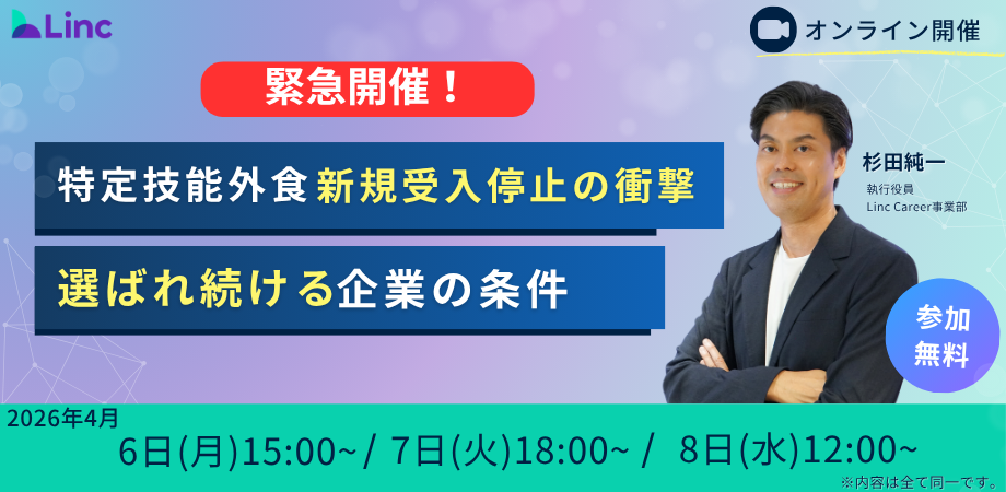 「日本に来てよかった」を最大化することをミッションに、外国人材の採用・定着支援AIプラットフォーム「Global Hub(グロハブ)」を展開する株式会社Linc(本社:東京都千代田区、代表取締役:仲 思遥、以下「当社」)は、2026年3月27日に出入国在留管理庁より発表された「外食業分野における特定技能1号の新規受入原則停止」を受け、外食事業者の皆様を対象とした緊急オンラインセミナーを開催いたします。