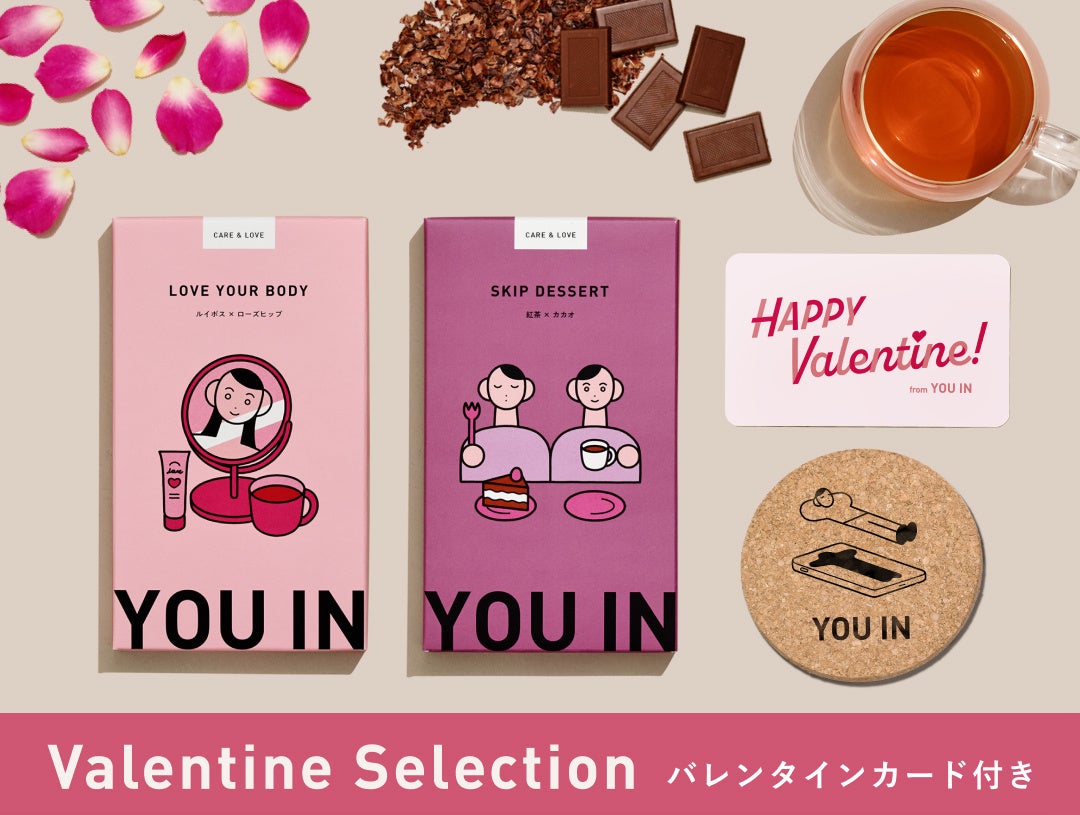 ◇内容:LOVE YOUR BODY(ルイボス × ローズヒップ)/ SKIP DESSERT(紅茶 × カカオ)/ YOU INコースター / バレンタインデザインカード