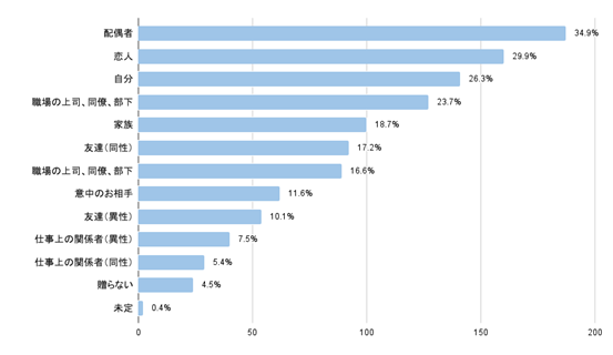 ■贈る相手は配偶者や恋人が多く、続いて自分へのご褒美、職場の方へ(図②)