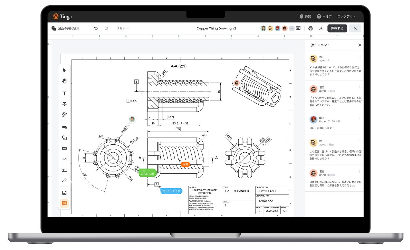 プロジェクトに携わるメンバー全員で、アップロードされた2D図面・スクリーンショット・部品の写真・PDFなどのデータを、ペン・ハイライト・タイピング・チャット機能を用いてリアルタイムで編集することができます。コメント機能も搭載されており、コメントを図面上にログとして残すことができるため、提案や変更された内容を記録することができます。
