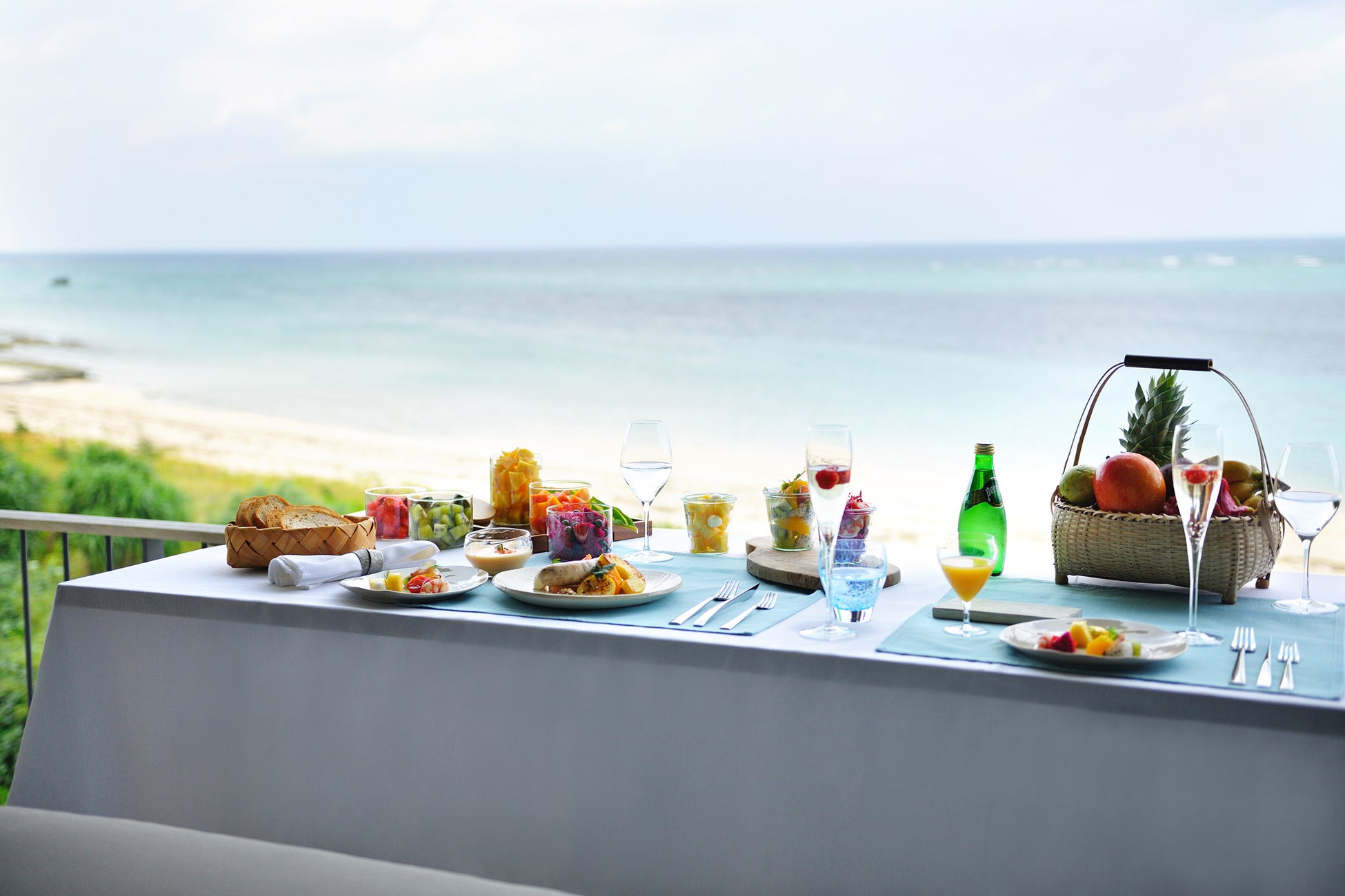 客室で食べたいときに仕上げる朝食は、のんびりと過ごしたいリゾートの朝にぴったりです。沖縄の原風景を感じる自然海岸に臨む客室では、テラスに料理を広げるほか、窓を開けて海風を取り入れたダイニングテーブルで味わうのもおすすめです。陽の光と共に色合いを変える美しい海と、真っ青な空がつくる水平線を眺めながら、リラックスした朝の時間を過ごします。