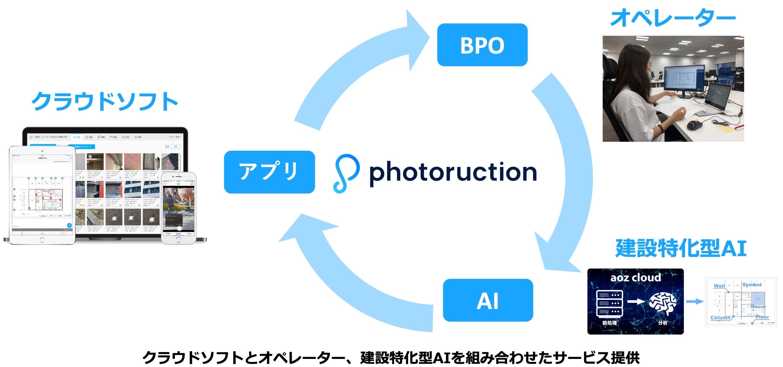 フォトラクションは工事写真や図面などの管理を効率化するクラウドサービスと、クラウドを通じて建設会社のデスクワークなどの業務代行を行う建設BPOサービスを組み合わせ、建築・土木の生産支援クラウド「Photoruction」として提供しています。今回開発した建設業特化AIを建設BPOサービスに組み込むことで、従来型のBPOと比較して低コストかつ速い納品スピードによるサービス提供を可能にしていきます。配筋検査の準備プロセスは、全国で新しく発生する年間50万件を超える建設プロジェクトで実施されている業務であり、1年間でおおよそ100万時間を超える時間が費やされていると予測されます(※2)。そのため建設BPOサービスを活用することで、産業全体において大幅な効率化を見込むことができ、生産性向上のインパクトは非常に大きいです。