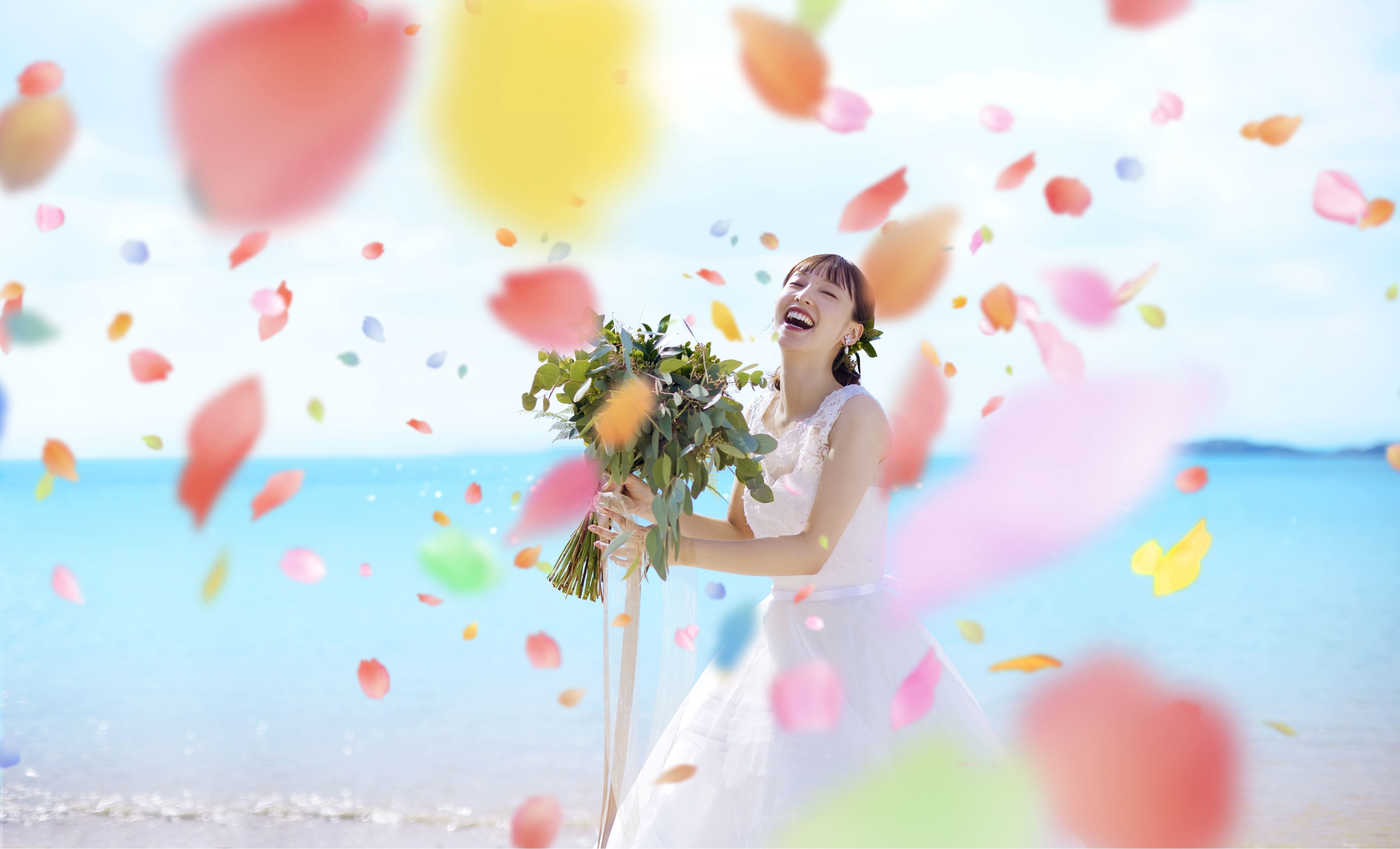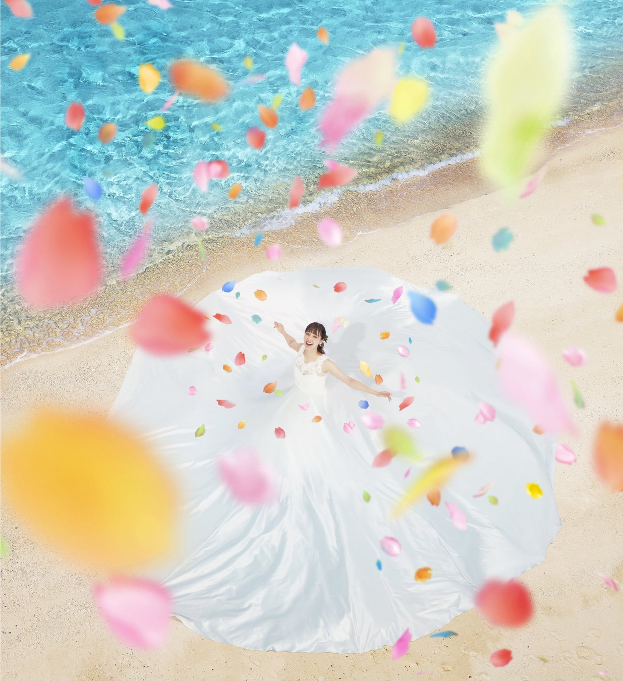 新キービジュアルには、結婚式の象徴であるウエディングドレスを大きな花に見立てるために約8mのスカートを使用。リゾートらしい青い海と白い砂浜のロケーションの中で、色鮮やかな花びらが空から舞う立体感を表現しました。山田愛奈さんの溢れる笑顔はこれから訪れる前向きな祝福をイメージ。