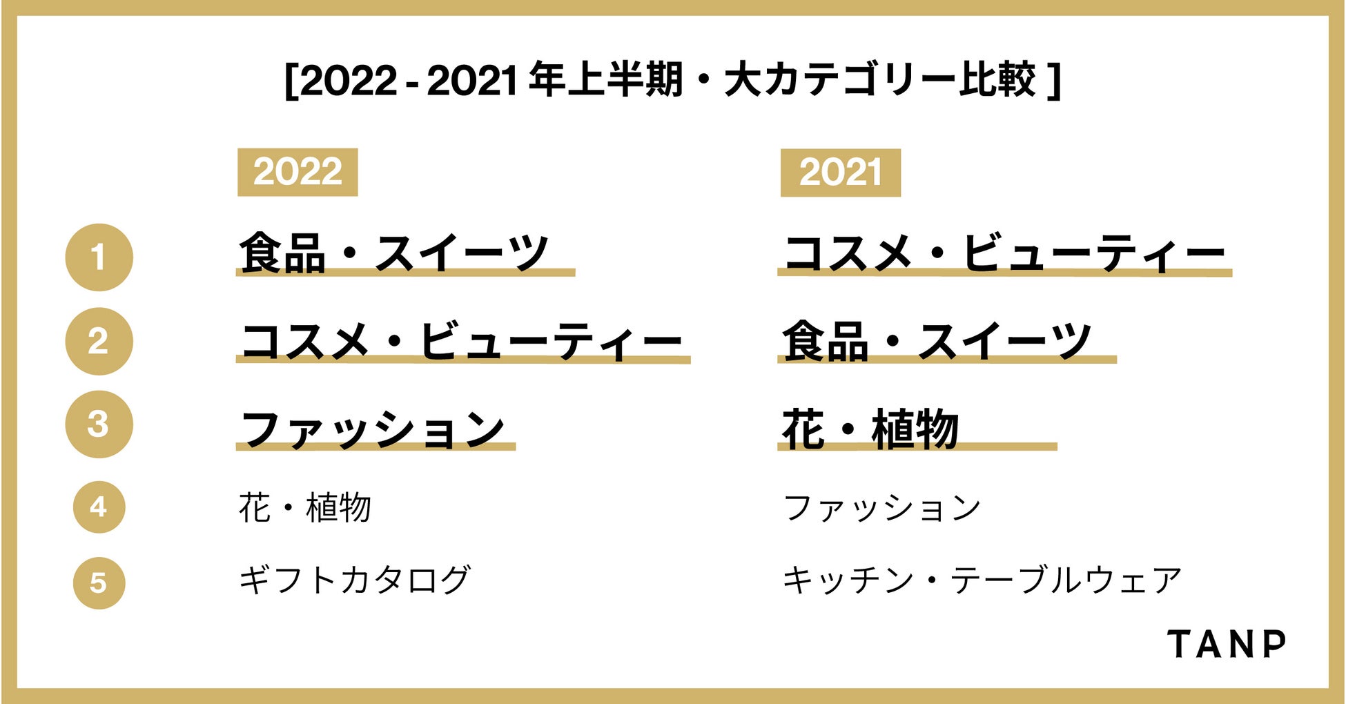 2022年1月〜6月において、TANPサービス内で人気の高いギフトカテゴリー上位は以下の通りとなりました(※1)。大カテゴリーではギフトとして想起されやすい「定番ギフト」が昨年に劣らず人気の高いカテゴリーとして上がっています。