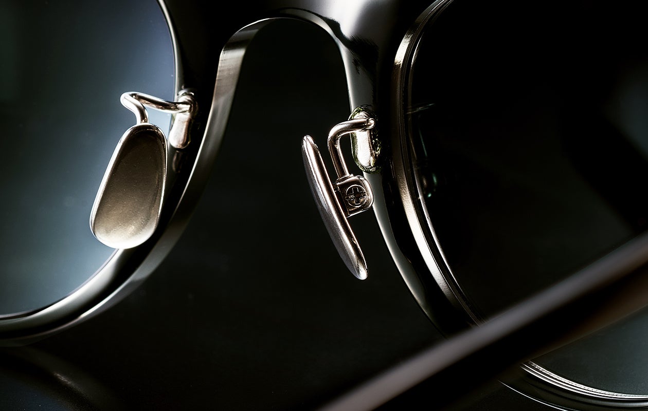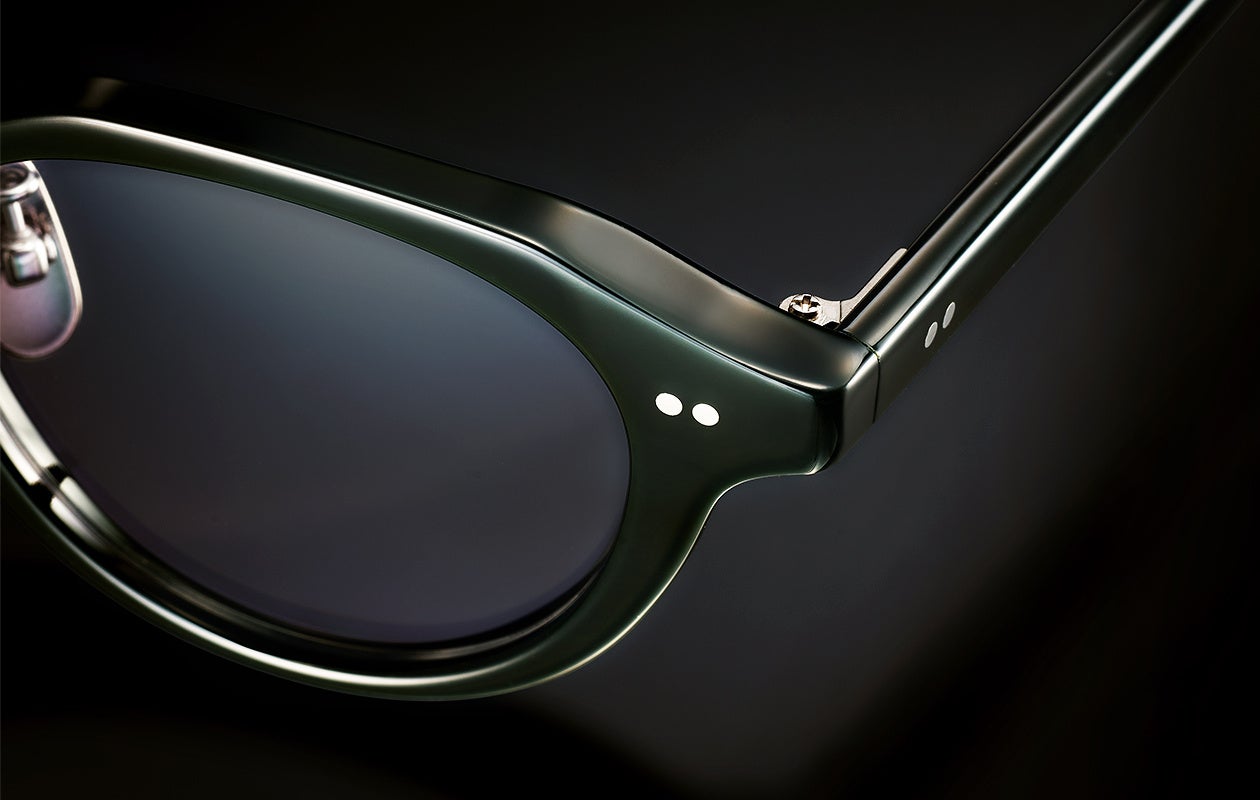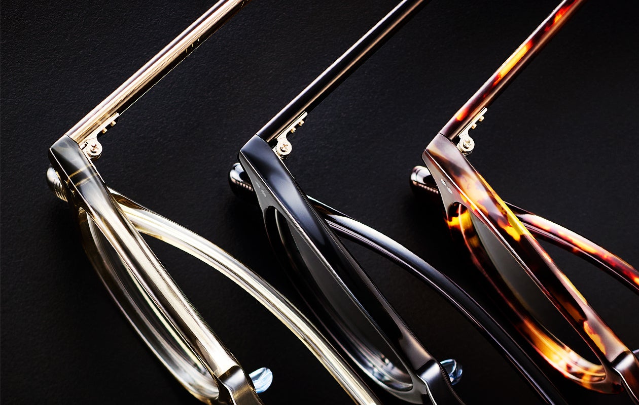 フロントとテンプルを1本1本、熟練の職人が手作業でピン留めして繋げる鯖江の伝統的な技法。高い強度、長く使い続けられる安心感とともに、見た目にもクラシカルな本物の良さを与えます。