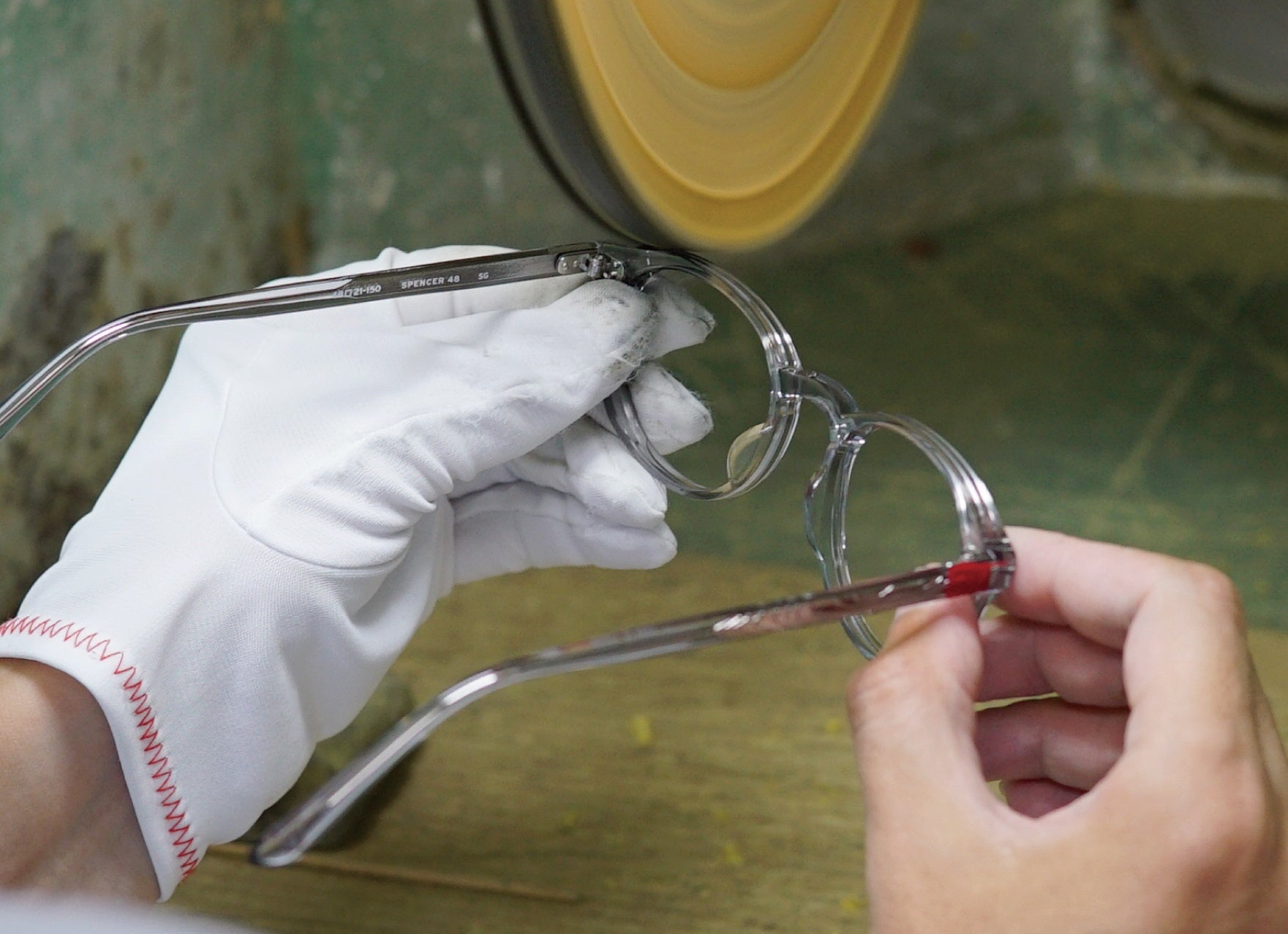 現在、プラスチック眼鏡フレームに使われる素材は、加工が容易で大量生産しやすいアセテートが主流で、昔ながらのセルロイドはいまや希少となりました。しかし加工が難しいからこそ、熟練した職人の手作業が求められるセルロイド製フレームは、今も根強い人気を誇ります。「磨き」を専門とする熟練工が時間をかけてひき出す、深みのある艶、肌に吸い付くような滑らかな質感はセルロイドならではの魅力です。