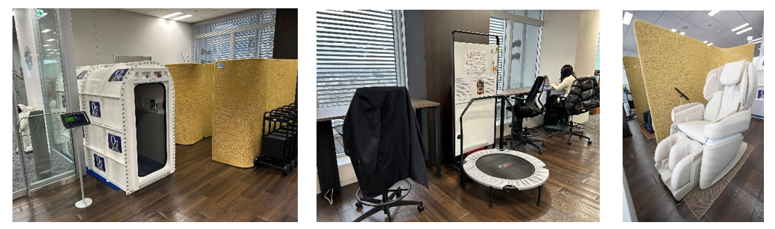 “健康がすべて”というスローガンのもと、オフィス内に酸素ボックスやトランポリン、ぶら下がり健康機、マッサージチェアを置くなど、社員の健康維持、気分転換、メリハリを利かせるための様々な企画を実施しています。昼休みや帰りがけなど社員それぞれが自分のタイミングで自由に利用しています。酸素ボックスについては、利用すると頭がすっきりすると好評です。