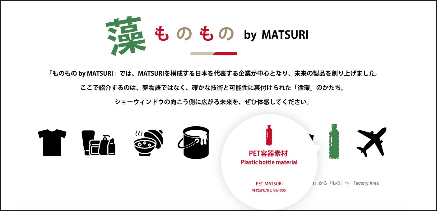 藻類が主役のファームエリアでは、ちとせ研究所が技術監修を担当しています。そして、持続可能なものづくりをテーマとするファクトリーエリアでは、MATSURIが「『藻』のもの by MATSURI」と題した展示を担います。ファームエリアの主役である藻類を「素材」とし、衣類、化粧品、食品、塗料、PET樹脂、航空機燃料や船舶燃料など、未来の暮らしを支える多様な製品を通じて、その可能性を伝えます。