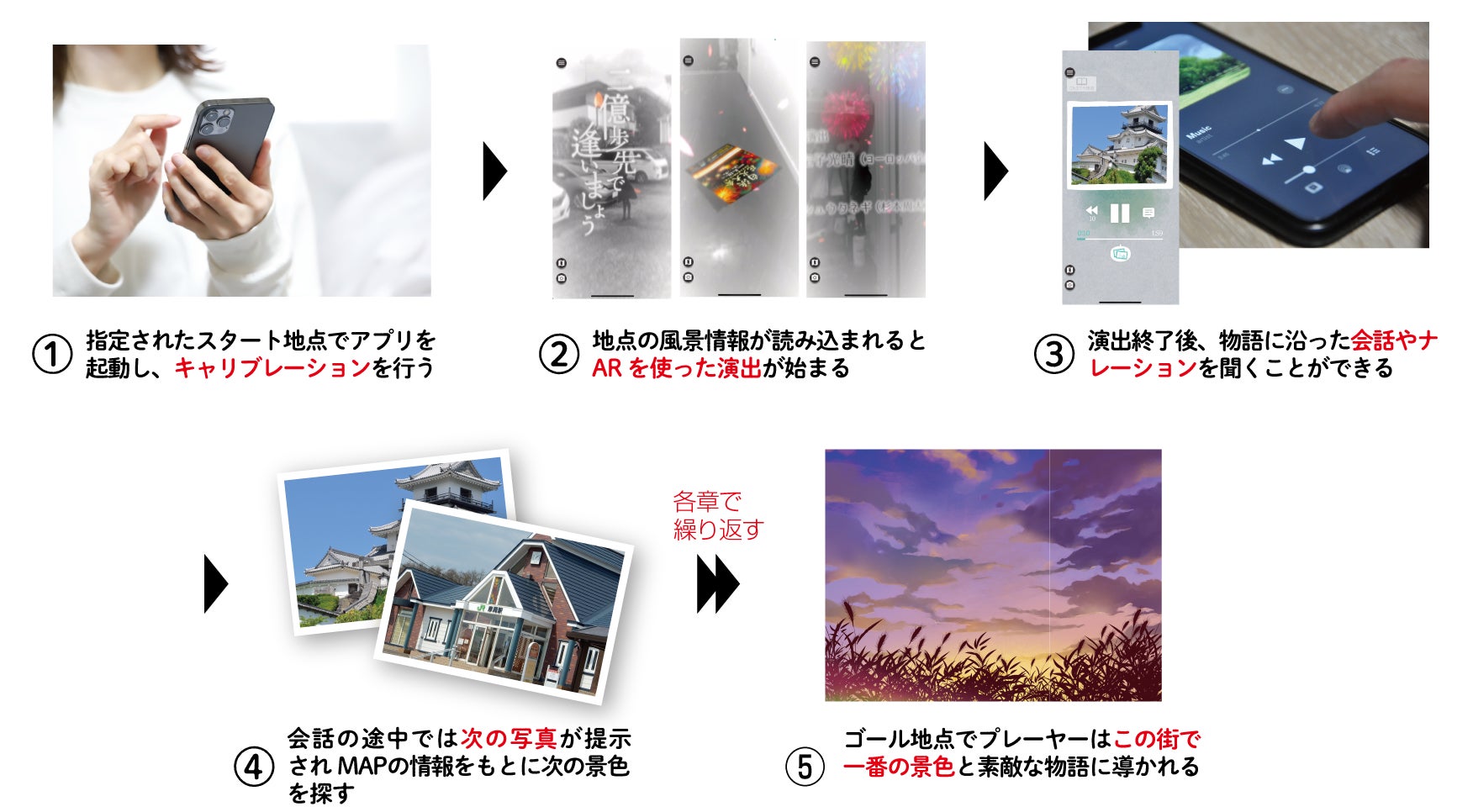 本コンテンツでは、アプリ内の地図や写真の情報を元に、街を探索しながら、ストーリーを体験していきます。計5箇所のARスポットでは、この街に転校してきたばかりの「ハル」と、少し不思議なお姉さん「サエ」との物語を追体験することができます。