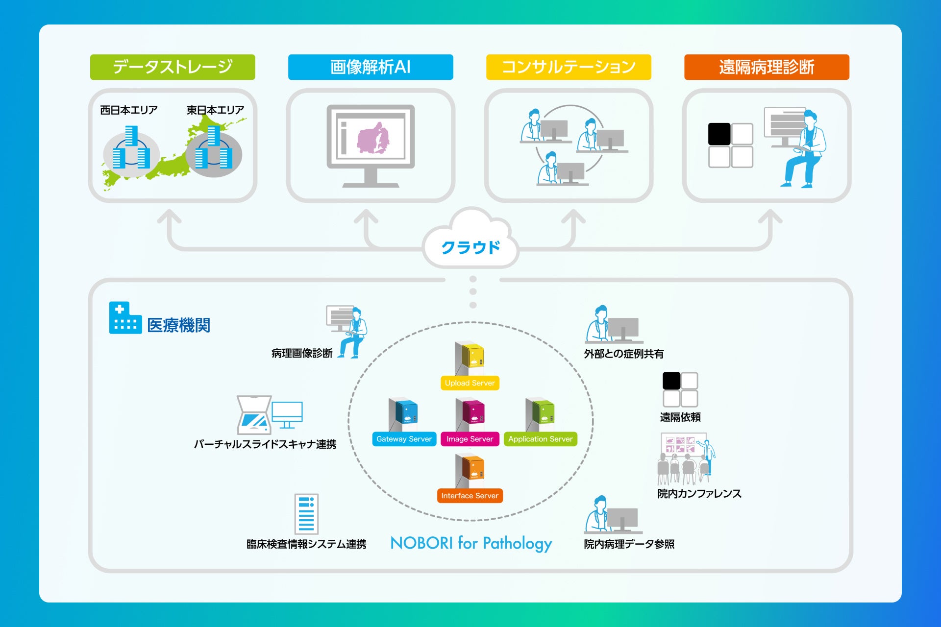 『NOBORI』では、クラウド上でのデータストレージ、画像解析AI、コンサルテーション、遠隔病理画像診断の4つのサービスを提供します。NOBORIでは、病理画像データに加え、CTやMRI、内視鏡などの他の検査種の画像データとの統合管理が可能になります。病理部門のワークフロー改善にとどまらず、院内全体のワークフロー改善にも貢献できるソリューションをご提供します。