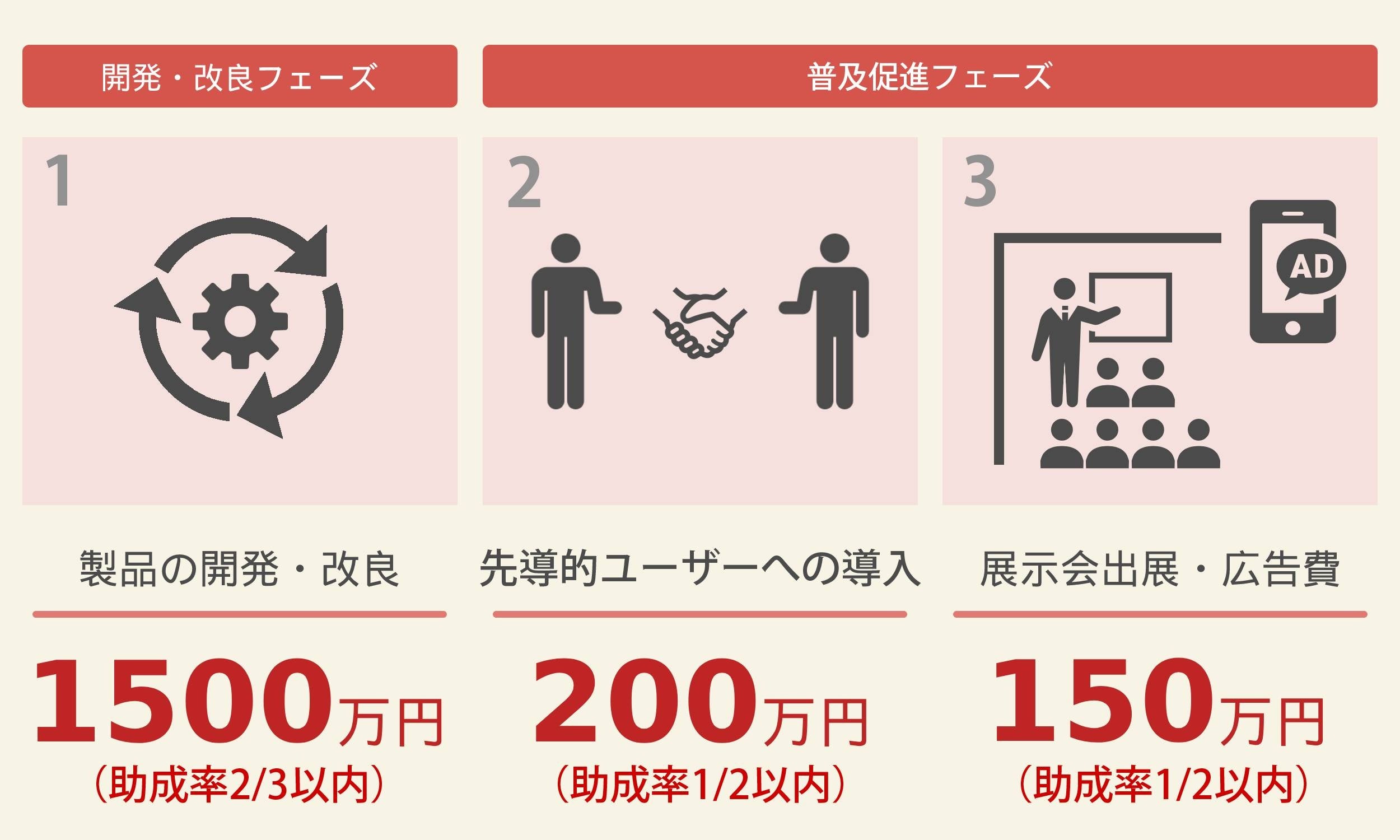 本助成事業は、製品の「開発・改良」から「普及促進」まで複数のフェーズを一貫支援します。製品のフェーズ別に異なる助成金を申請する必要がないため事務負担の軽減を期待できます。(1の申請は必須、2・3の申請は任意となります。)
