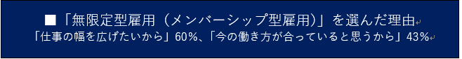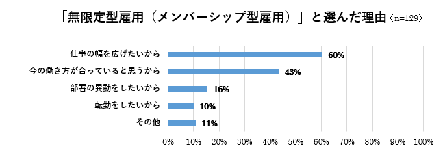 志望する雇用制度で「無限定型雇用(メンバーシップ型雇用)」と選んだ人にその理由(複数選択)を聞いたところ、「仕事の幅を広げたいから」(60%)、「今の働き方が合っていると思うから」(43%)、「部署の異動をしたいから」(16%)、「転勤をしたいから」(10%)の順でした。「その他」では「安定」をあげる声が多く見られました。