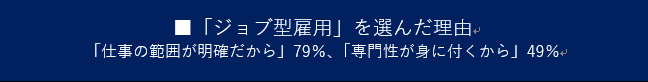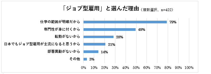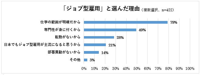 希望する雇用制度で「ジョブ型雇用」と選んだ人にその理由(複数選択)を聞いたところ、「仕事の範囲が明確だから」(79%)、「専門性が身に付くから」(49%)、「転勤がないから」(28%)、「日本でもジョブ型雇用が主流になると思うから」(21%)、「部署異動がないから」(14%)の順でした。「その他」では「強みを生かせる」「無限定型の評価が不明瞭」などの意見がありました。