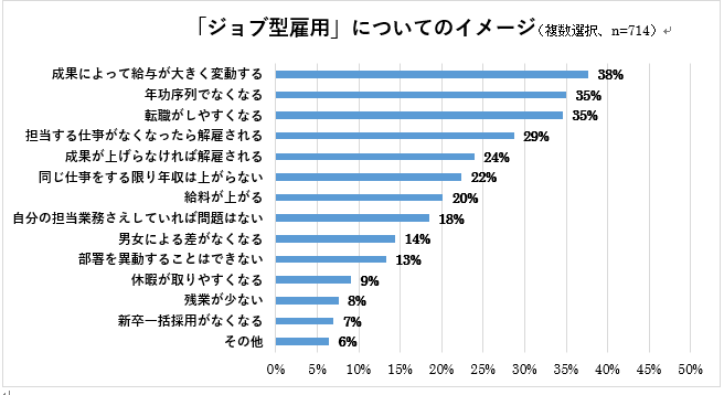 現在の雇用制度が「ジョブ型雇用」でない方に、「ジョブ型雇用」についてのイメージを選んでもらったところ(複数選択)、「成果によって給与が大きく変動する」(38%)、「年功序列でなくなる」(35%)「転職がしやすくなる」(35%)が上位3つで、続いて「担当する仕事がなくなったら解雇される」(29%)、「成果が上げらなければ解雇される」(24%)と雇用への不安をあげる人も多くいました。