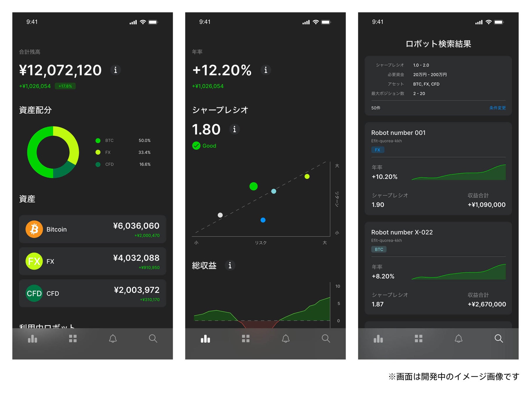 現在は、投資対象資産を「ビットコイン」「外国為替証拠金」「日経225やNYダウ等のCFD」としておりますが、今後「上場株式」や「ETF」で利用できるよう、開発も進めております。