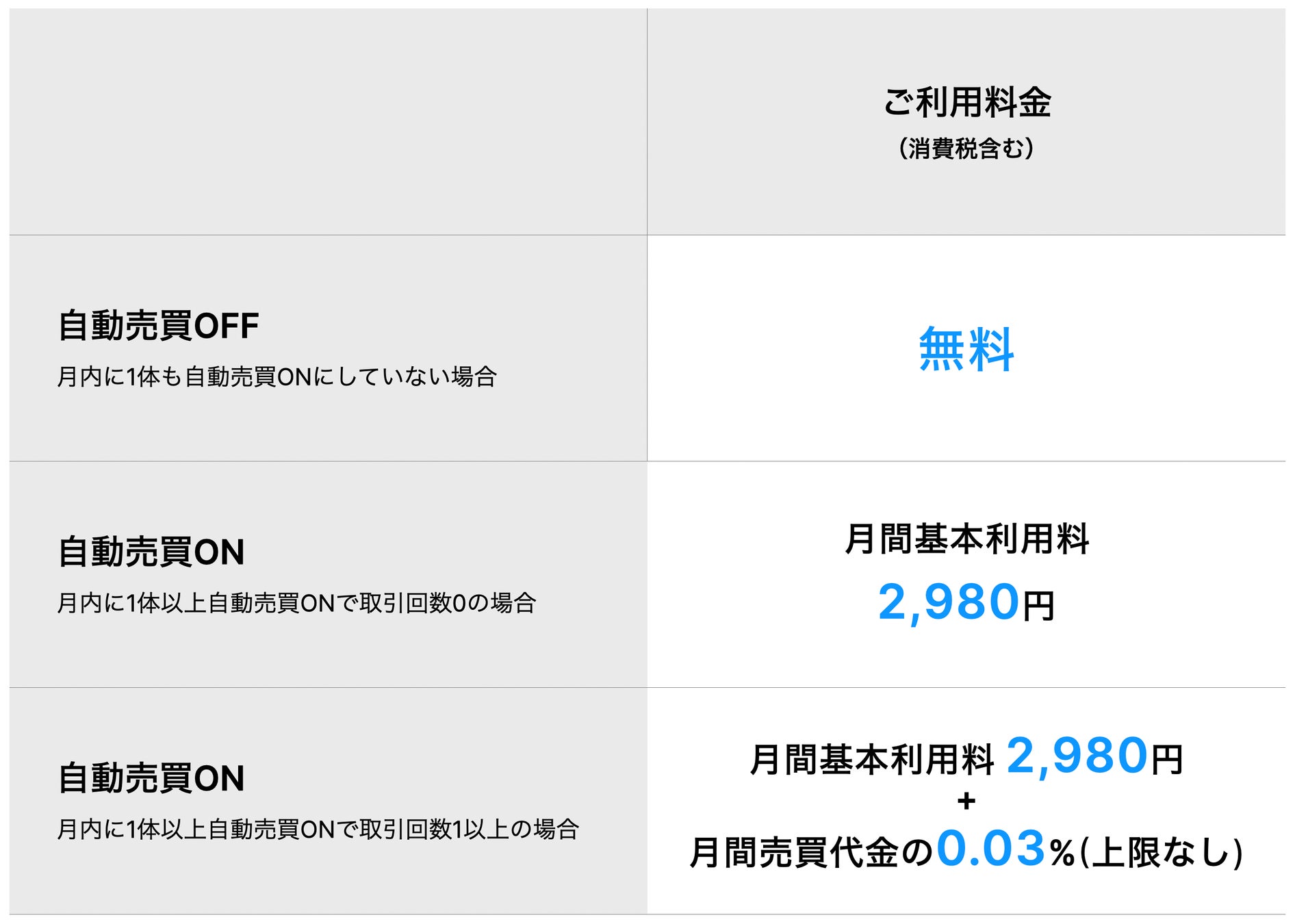 従来、月間の総売買の金額によって決定をしておりましたQUOREAの利用料金システムを年内で終了し、来年1月1日以降は、月内に少なくとも1体自動売買をONにした場合に基本料金として2,980円を頂戴し、また、それとは別に、月内に1回以上取引が発生した場合に、月間売買代金の0.03%(上限なし)が発生する利用料金体系とさせていただきます。