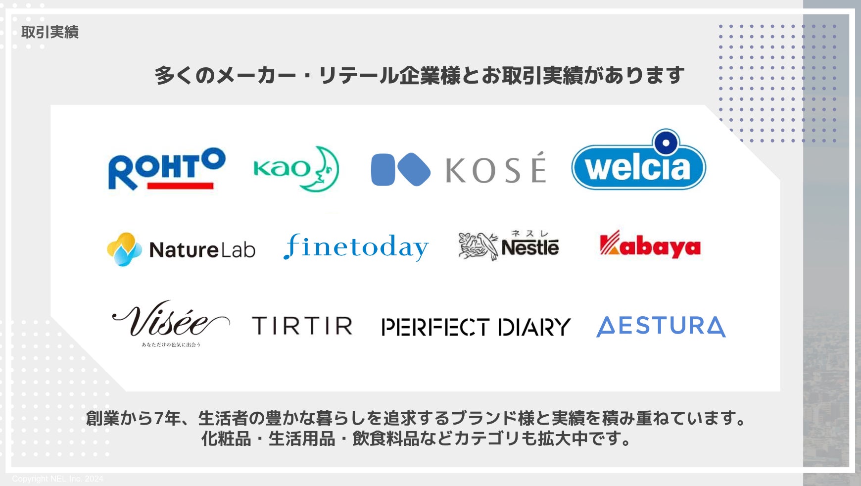 NELは創業から7年、生活の豊かな暮らしを追求する多くのメーカー・リテール企業様と実績を積み重ねています。化粧品・生活用品・飲食料品などカテゴリも拡大しています。