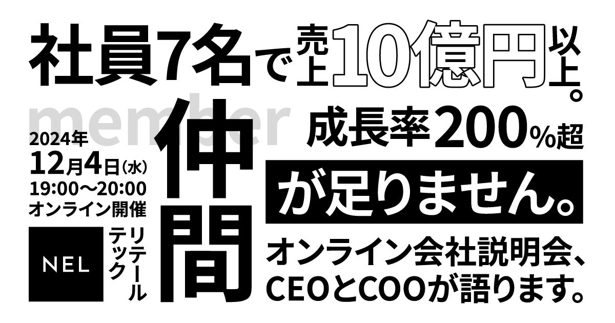 150兆円の小売市場へ挑むリテールテックカンパニーNEL株式会社(本社:東京都渋谷区、代表取締役社長:西田 陸)は、三井住友海上キャピタル株式会社、三菱UFJキャピタル株式会社、SMBCベンチャーキャピタル株式会社、オリックス・キャピタル株式会社、株式会社ベクトルなど国内の投資家 計7社を引受先とした第三者割当増資により、合計6.5億のシリーズBラウンド資金調達を完了し、創業からの累計資金調達額は約7.5億円となりました。