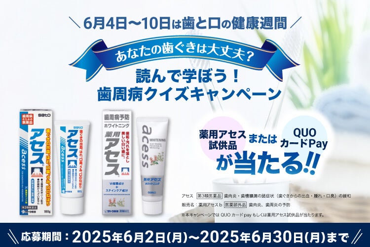 佐藤製薬株式会社(本社:東京都港区、社長:佐藤誠一)は、6月の「歯と口の健康週間」に合わせ、2025年6月2日(月)よりQUOカードPayまたは薬用アセス試供品が当たる『読んで学ぼう!歯周病クイズキャンペーン』を実施いたします。