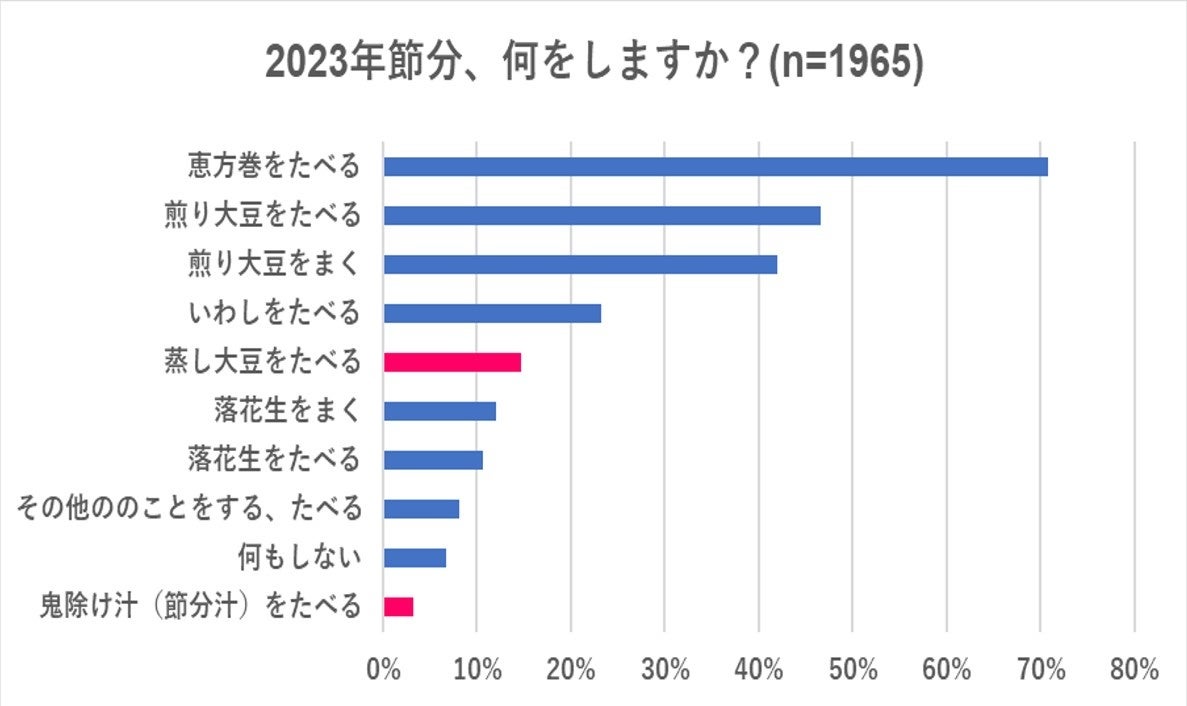 昨年マルヤナギが実施した調査では、節分に「蒸し大豆を食べる」「鬼除け汁を食べる」と答えた方の合計は18%にのぼりました。(自社インターネット調査n=1,965)