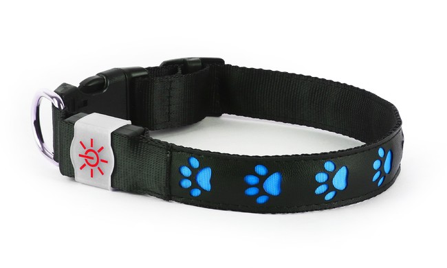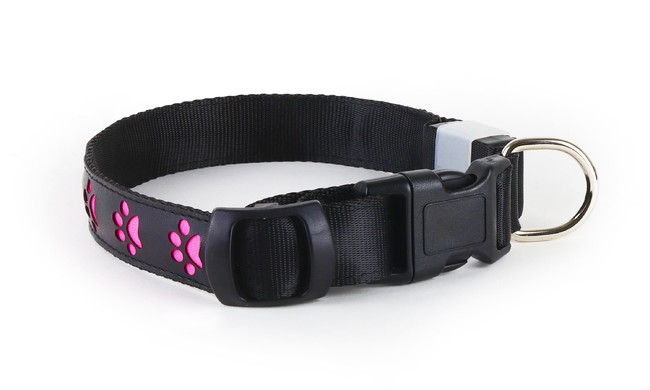 可愛いパウ柄が光る首輪。ブルーとピンクの目立ちやすいカラーが闇を照らします。