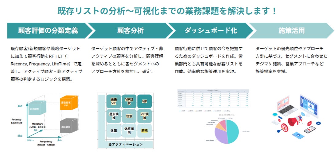 本サービスは、BtoB企業のデジタルマーケティング(デジマ)における長年の課題である「顧客リストからの商談化の難しさ」を解消し、眠っている顧客データの隠れた価値を引き出します。
