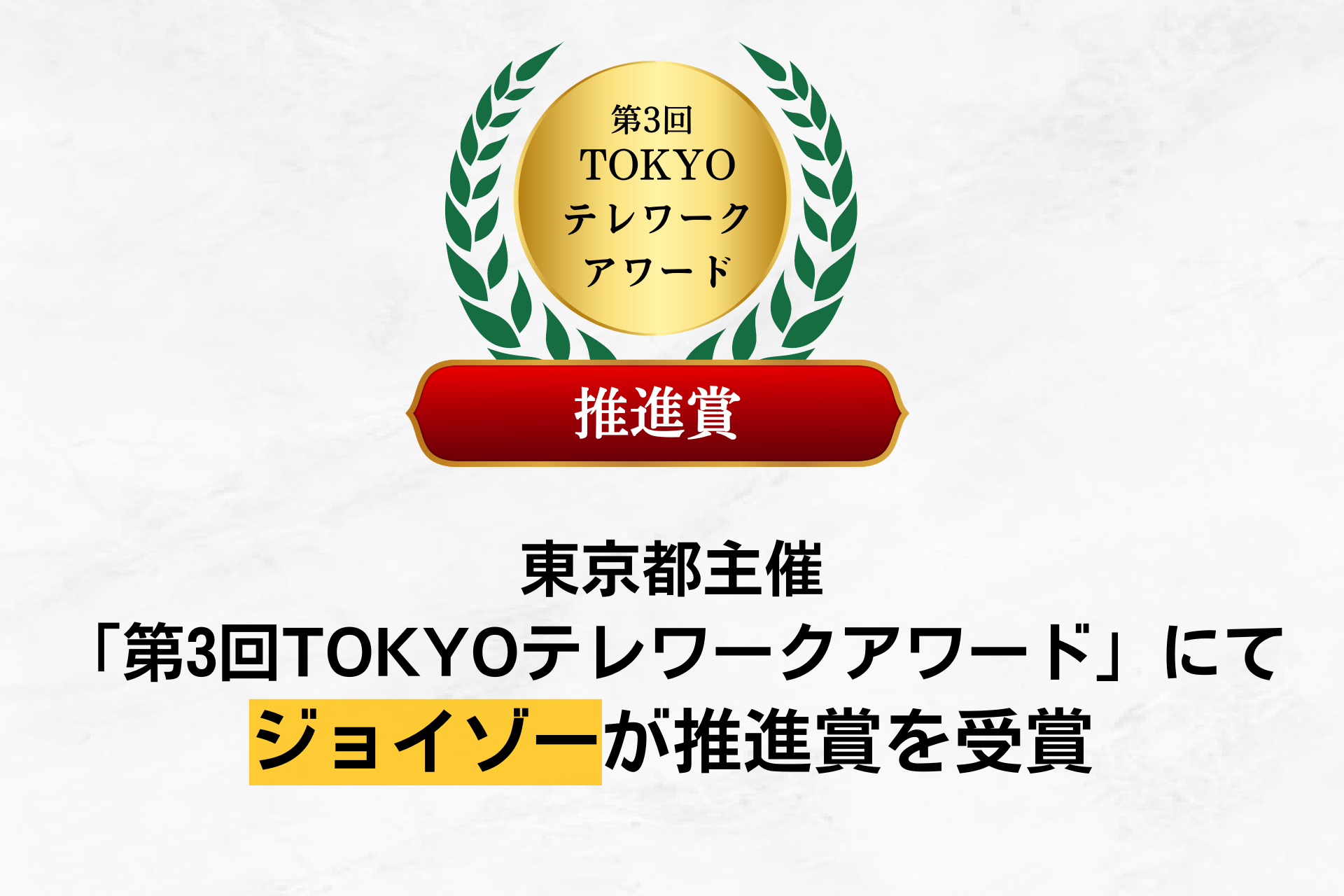 株式会社ジョイゾー(本社:東京都江東区、代表取締役社長:四宮 靖隆、以下 ジョイゾー)は、このたび第3回TOKYOテレワークアワードにて、推進賞を受賞しましたことをお知らせします。弊社は2016年6月よりテレワーク、2019年1月にワーケーションを導入し、社員の働き方に対する取り組みを積極的に進めて参りました。今回このような社員の自律と成長を促す柔軟な働き方がモデル的/先進的事例として評価され、今回の受賞に至りました。