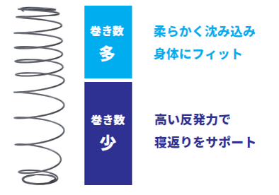 上部コイルは、コイルの巻き数を多くし身体のラインに併せてやわらかくフィットさせ、下部コイルでは、巻き数を少なくすることでしっかりした反発力で身体を支えて、寝返りをサポートいたします。