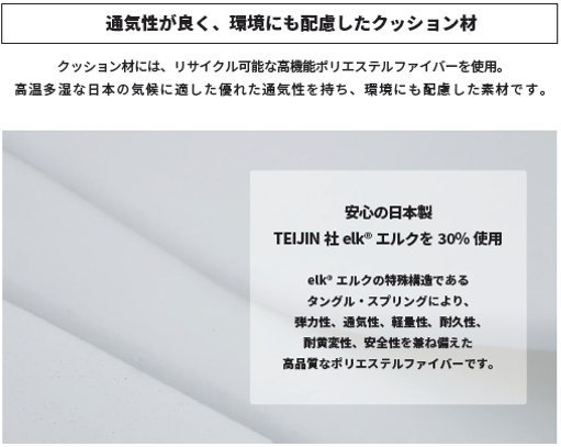 クッション材には、TEIJIN社elk®(エルク)を30%使用しています。elk®(エルク)の特殊構造であるタングル・スプリングにより、通気性はもちろんのこと、弾力性、軽量性、耐久性、そして安全性を兼ね備えています。