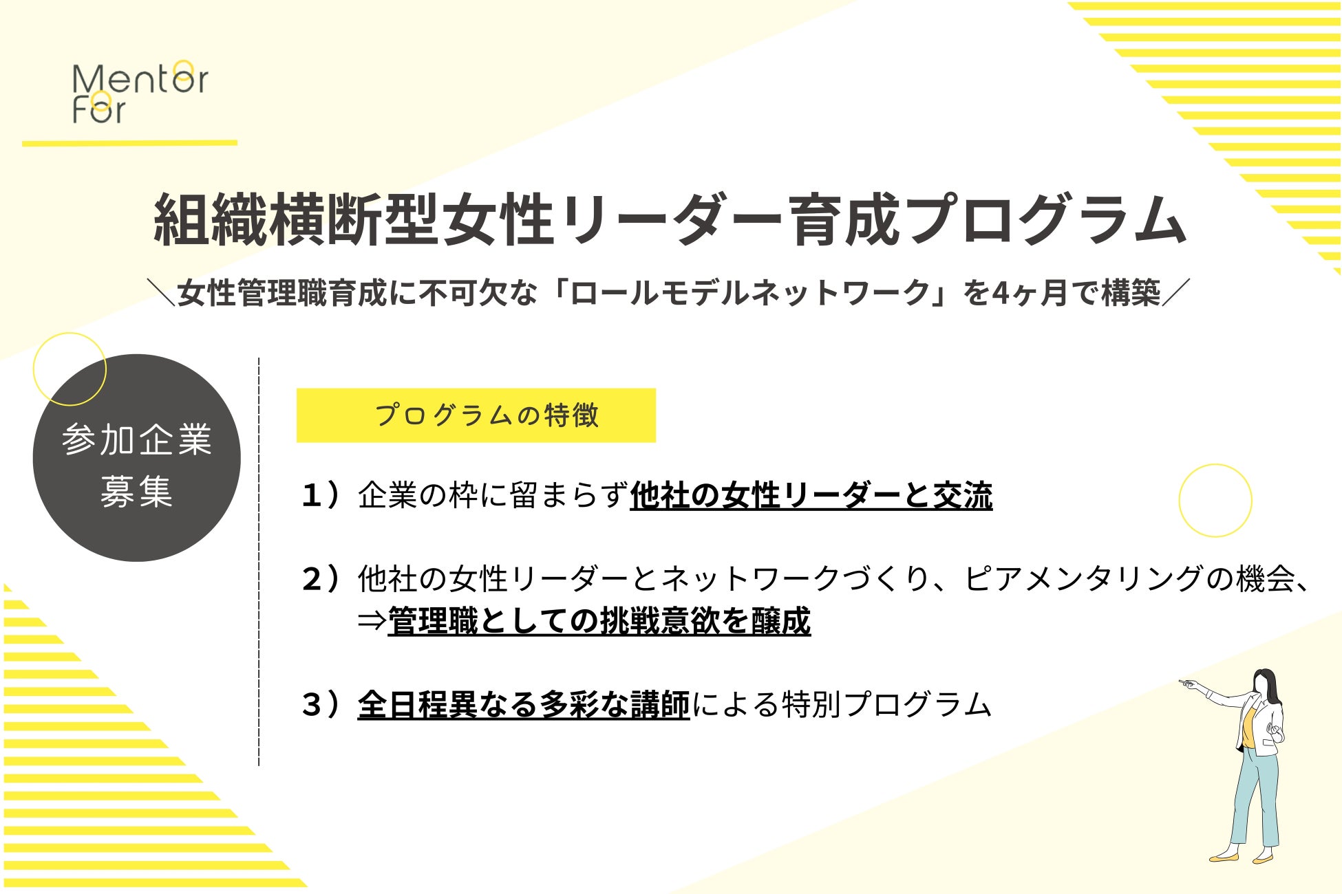 企業のDE&I(Diversity, Equity & Inclusion)・女性活躍推進を目的とした、社外メンターの育成・マッチング・社内メンター制度支援を提供する株式会社Mentor For(東京都渋谷区、代表取締役・池原真佐子、以下Mentor For)は、企業をまたいだ組織横断型女性リーダー育成プログラムを開催いたします。この程参加企業の募集が開始されました。このプログラムは、2024年5月から8月まで、月1回の日程で実施されます。