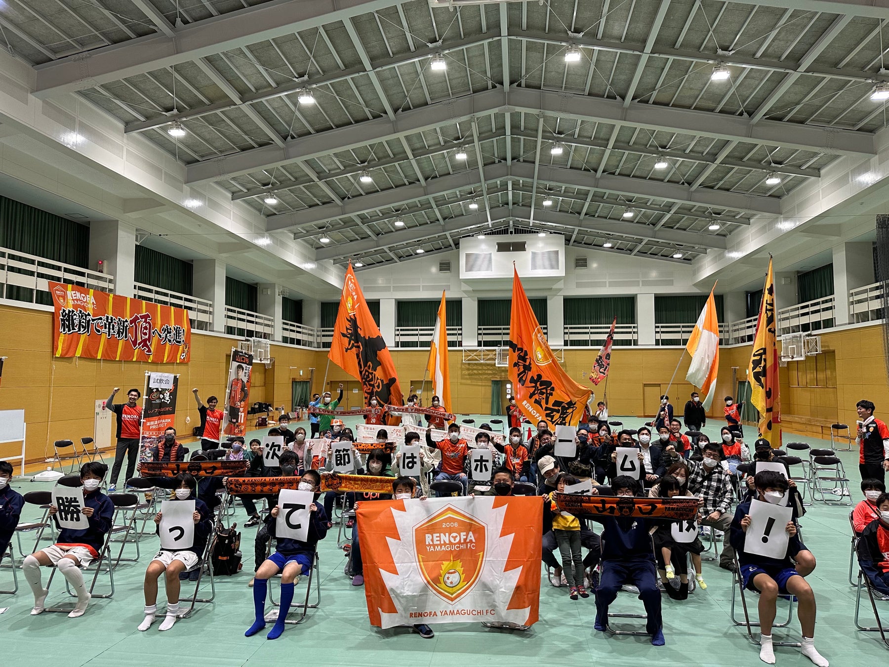湯田中学校の生徒による企画で、3月19日のレノファ山口・アウェイ試合のパブリックビューイングを湯田中学校体育館で開催。 中学生、地域の多様な多世代の方約100名が参加。