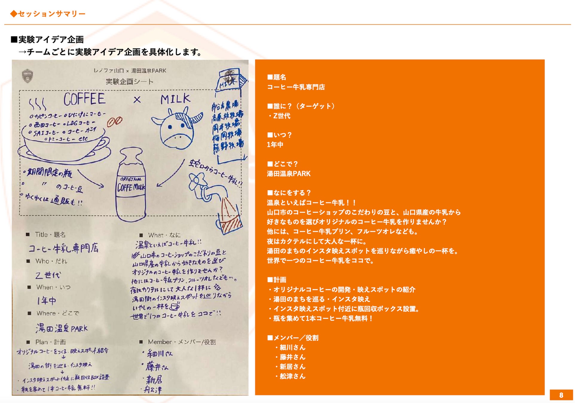 地域に密着し社会連携活動を推進するレノファ山口を中心として、フューチャーセッションズのファシリテーションにより、山口市、企業、湯田温泉旅館協同組合、大学生(山口大経済学部観光政策学科)、中学生(山口市立湯田中学校)など多世代の多様なステークホルダーによる共創セッションを複数回開催。ありたい姿のビジョンと3つの共創実験企画を創出し、実施しました。