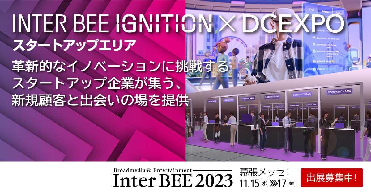 メディア総合イベント「Inter BEE 2023」の特別企画「INTER BEE IGNITION × DCEXPO」において、 メディア・エンターテインメント産業で革新的なイノベーションによる成長を目指すコンテンツ関連スタートアップ企業が一堂に会し、 新たな顧客を開拓してビジネスを展開する「スタートアップエリア」を新設します。