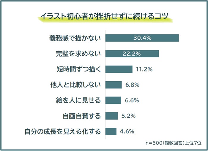 「イラスト初心者が挫折せずに続けるコツ」の1位は「義務感で描かない(30.4%)」でした。2位「完璧を求めない(22.2%)」も20%を超えて多くなっています。