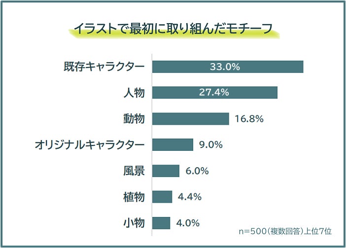 趣味や仕事でイラストを描いている500人に「イラストで最初に取り組んだモチーフ」を聞いたところ、最も多かったのは「既存キャラクター(33.0%)」、次いで「人物(27.4%)」でした。