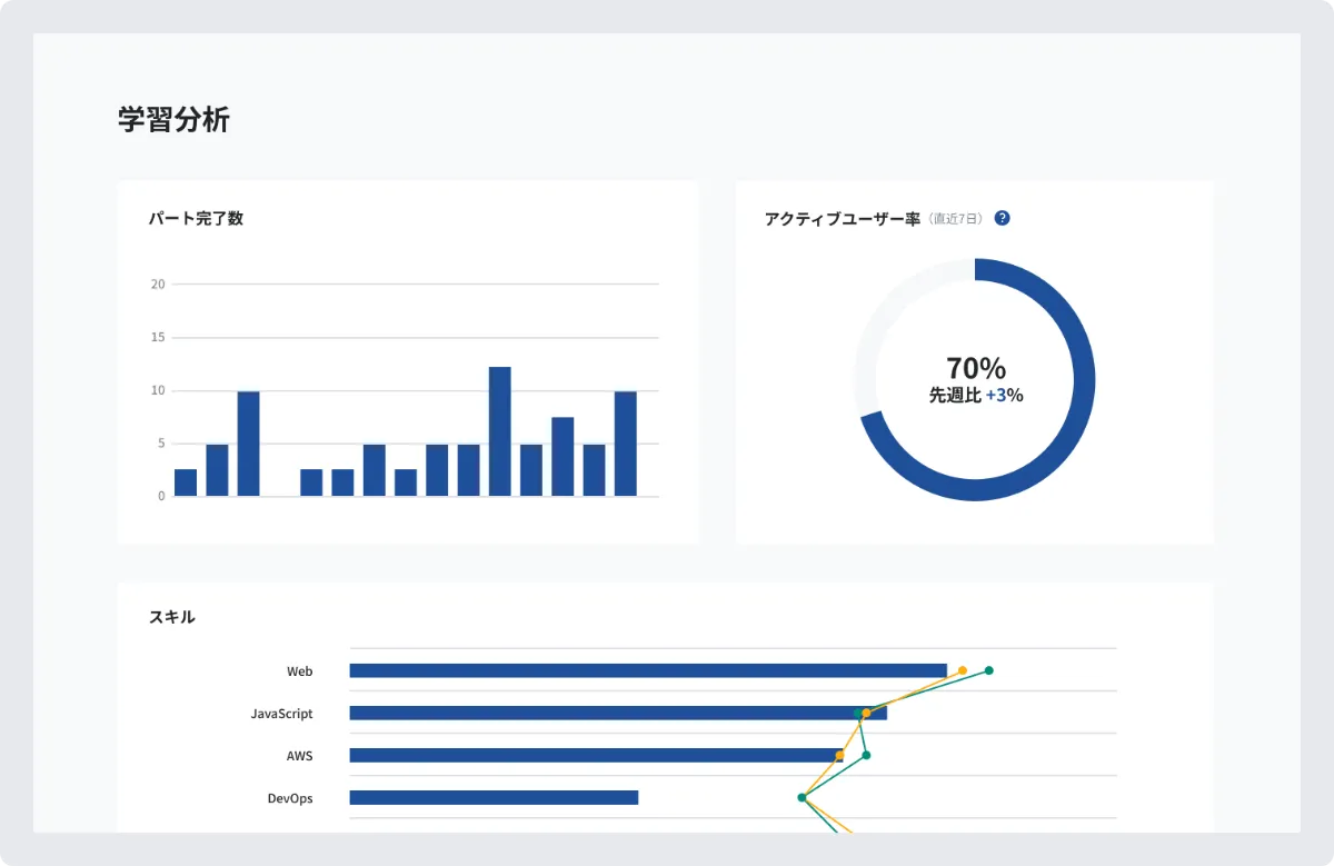 「Techpit for Enterprise」では、学習プログラムの提供だけでなく、人材育成計画の策定から学習の完了支援まで、「リスキリング」に必要なプロセスを一気通貫で支援します。スキルアセスメントを受講することで、学習者の現在の理解度をチェックし、各個人の理解度に応じた最適なリスキリングプラン、学習カリキュラムを提供します。