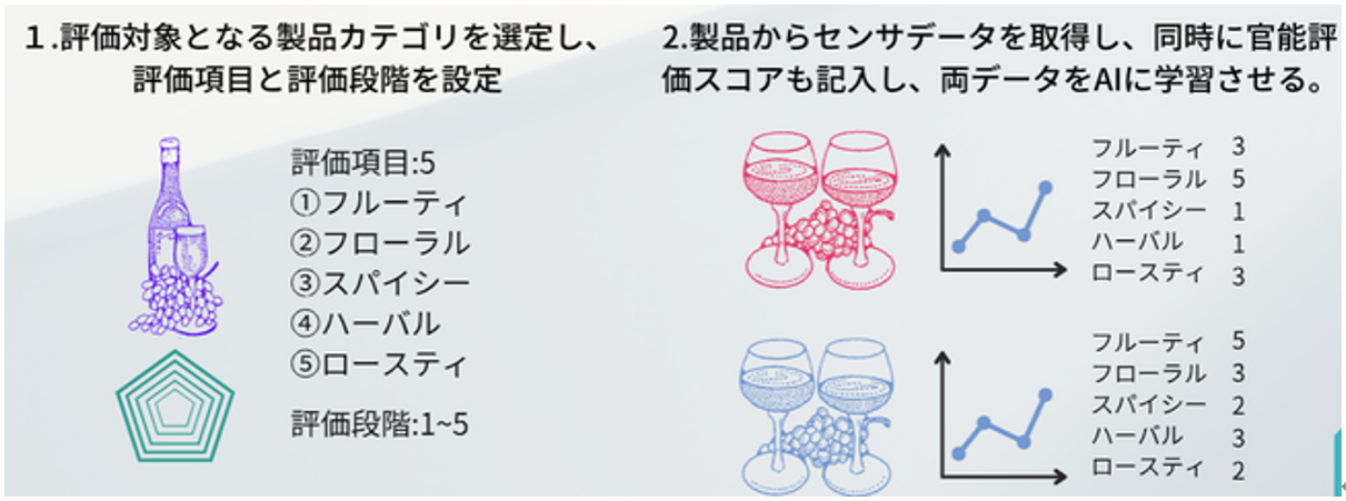 対象となる製品のにおいデータとそれらの人による官能評価を紐づけた形でAIに学習させることで、それ以降はAIによる官能評価が可能となります。