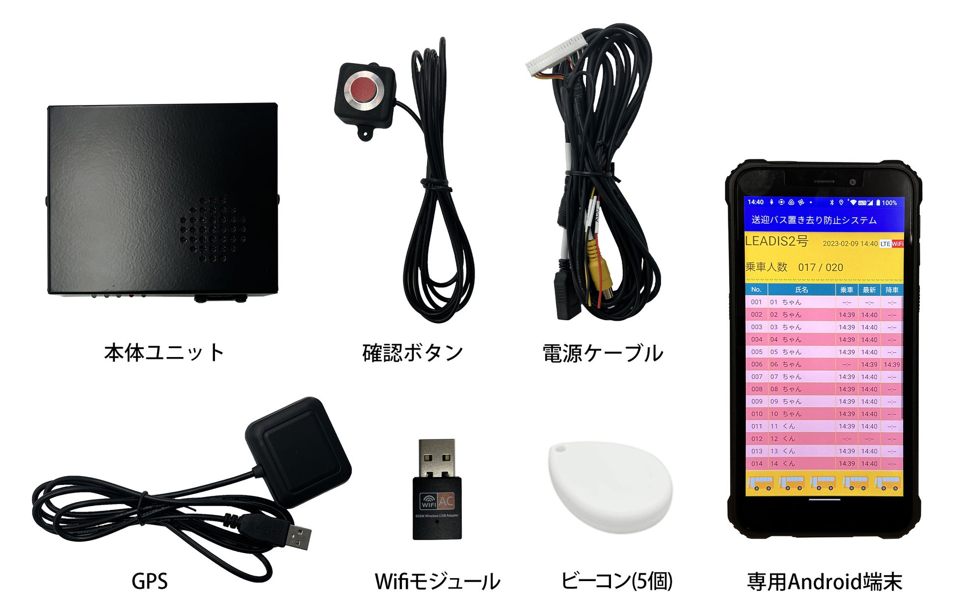 ◆商品構成:本体ユニット、確認ボタン(ケーブル約10m)、電源ケーブル(約3.5m)、専用Android端末、ビーコン(5個)、Wifiモジュール、GPSアンテナ(ケーブル約1.5m)、サーバー運用及び通信監理