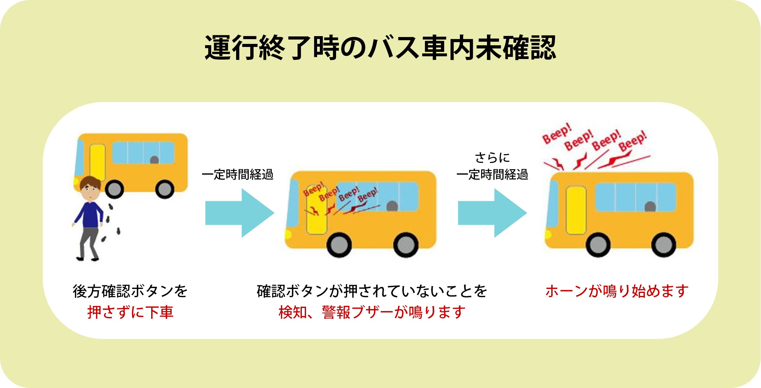 ◎バス後方に設置された確認ボタンを押さずに下車すると警報ブザーがなり、更に一定時間経過するとバスの「ホーン」も鳴ります。