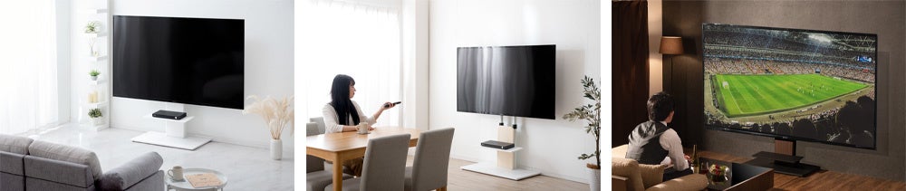 大型テレビ専用テレビスタンドは、広いスペースを必要とするローボードと違い、壁寄せにすることで省スペースに設置することができます。今回発売したテレビスタンドは「ホワイト×ホワイト」「ホワイト×オーク」「ブラック×ブラウン」の3色を展開しており、お部屋の雰囲気に合わせて色を選択することで、まるで壁掛けのようなスタイリッシュさを演出します。